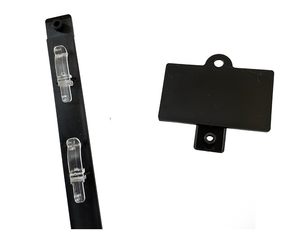 Univerzální display strip pro zavěšení produktů, s 12 háčky a topperem. 2x strip 360 mm (každý obsahuje 6 pozic pro produkty, rozestupy 60 mm) a 1x topper.