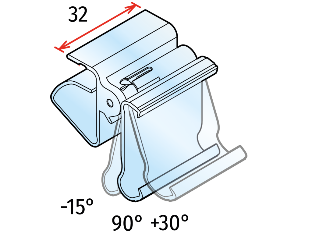 Držák elektronických cenovek, pro nasunutí na hranu police tl. 12-20 mm. Nastavitelný sklon do 3 pozic: 90°, -15°, +30°. Balení 20 ks.