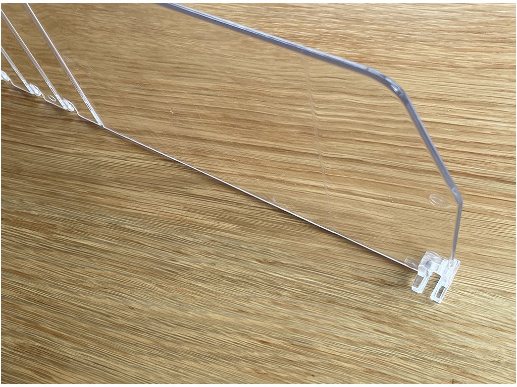 Regálový rozdělovač, výška 120 mm, délka 485 mm, bez čelního stopperu.