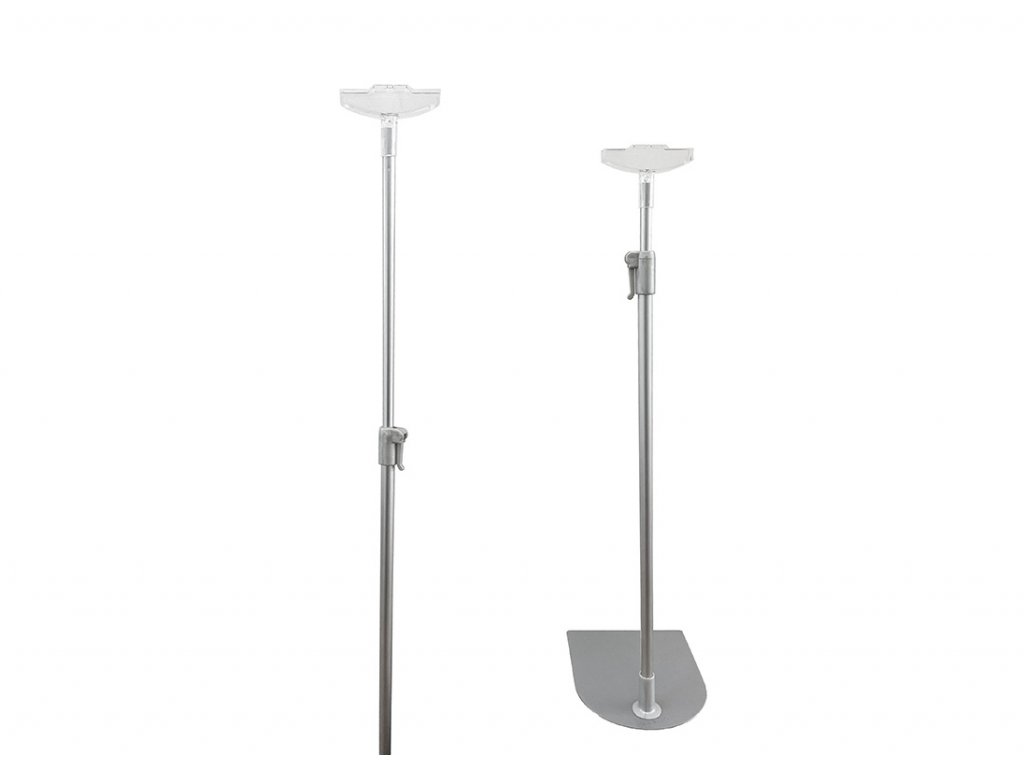 Stříbrná teleskopická tyč s nastavitelnou délkou, se stabilní základnou a s čirým držákem pro plastové info rámečky.