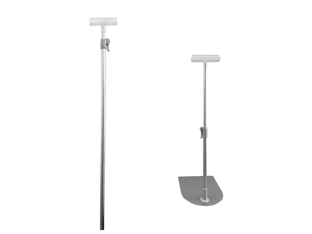 Stříbrná teleskopická tyč s nastavitelnou délkou, se stabilní základnou a s univerzálním MASTER držákem, do kterého lze vložit různé poutače tloušťky od 1 do 5 mm.